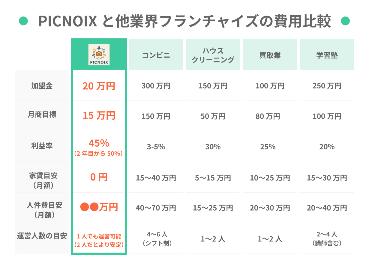 他フランチャイズに比べると、PICNOIXは店舗を構えないので、固定経費が圧倒的に安いです。